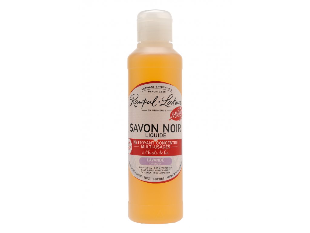 Černé mýdlo Rampal Latour je vysoce koncentrovaný tekutý čistící prostředek, vyjímečně účinný - a přitom k materiálům velmi šetrný - odstraňovač špíny. Díky lněnému oleji ve složení dodává povrchu lesk, výživu, čistotu a ochranu, mýdlem ošetřené předměty a povrchy zanechávají ve vašem domě lehkou a příjemnou vůni levandule.